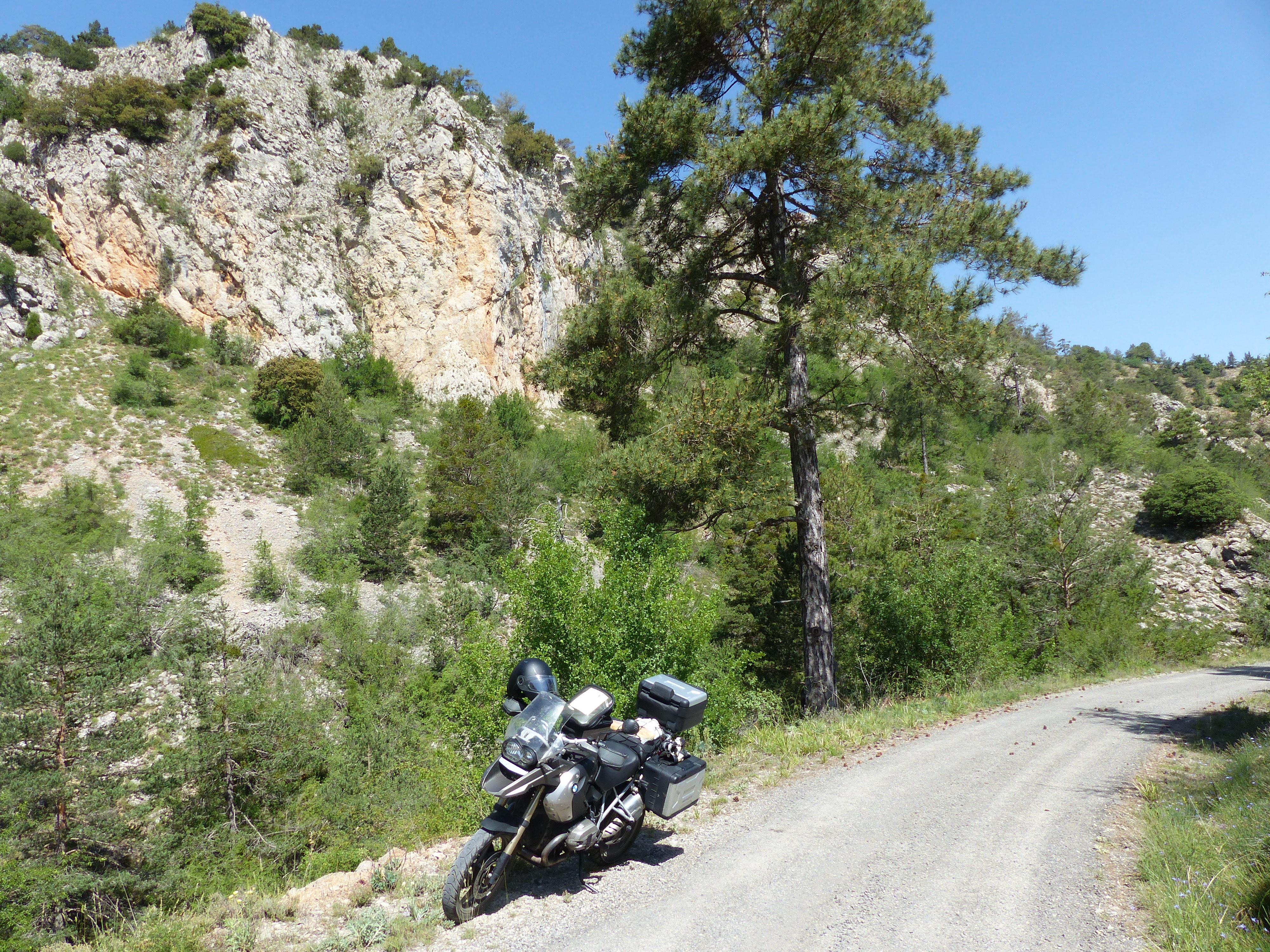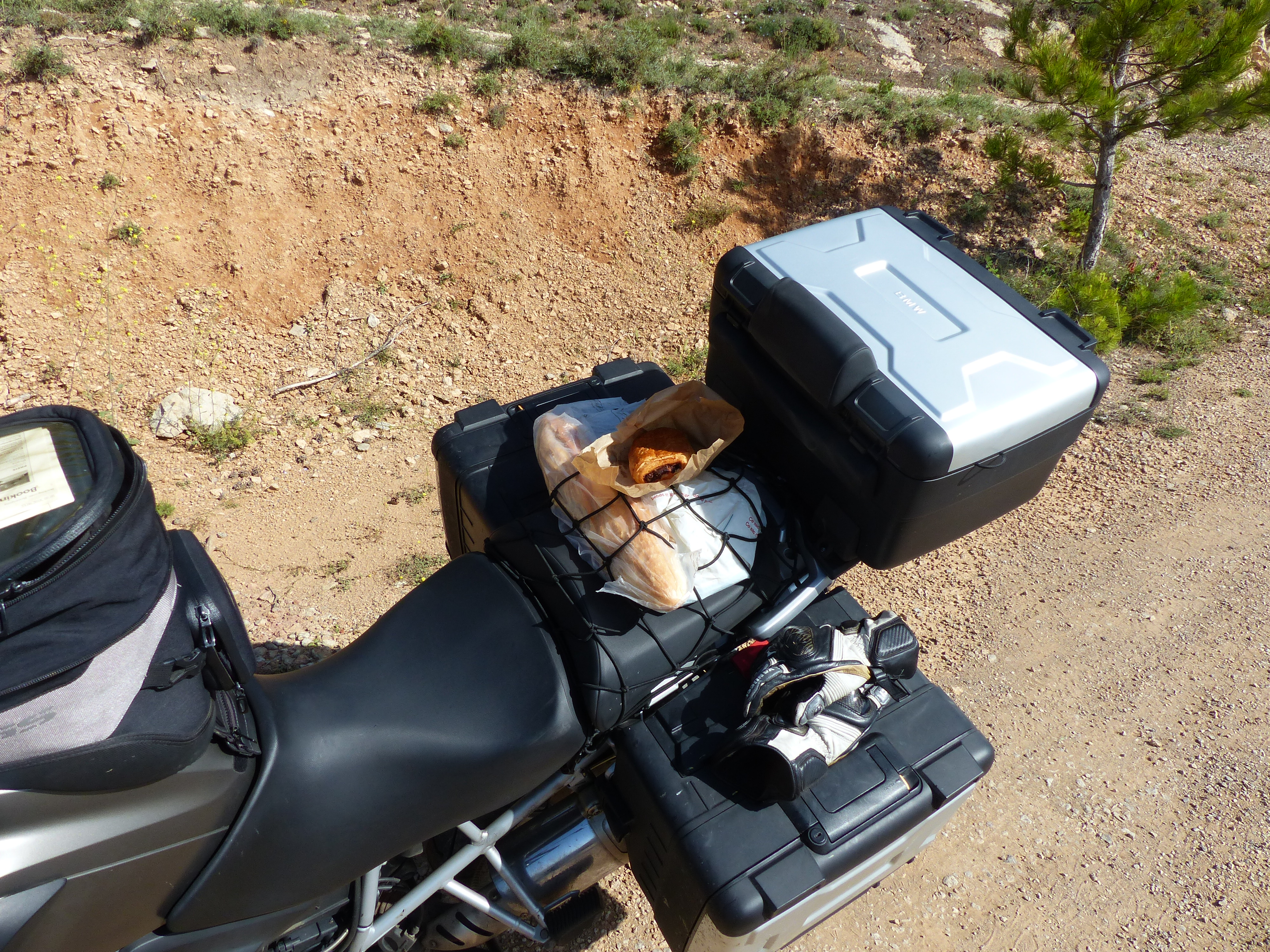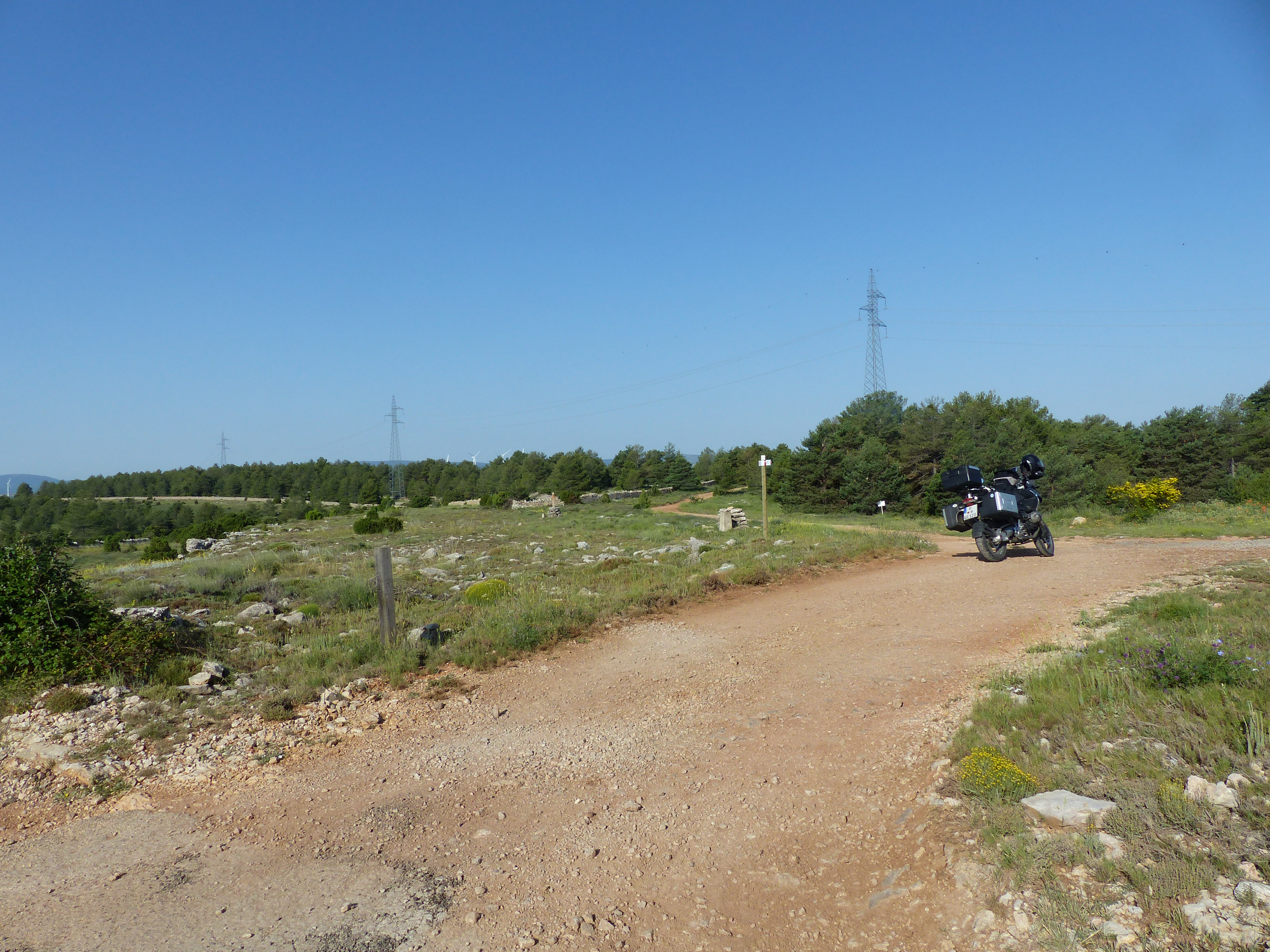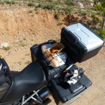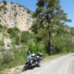 Gefolgt war das Frühstück von einer circa 20km lange unbefestigte Straße, auf der die beiden Fotos auf der rechten Seite enstanden sind. Einen Kilometer vor den Fotos trabte mir ein verwilderter großer Hund entgegen, der ein bereits angefressenes totes Reh im Maul hatte, mir nur einen kurzen Blick zuwarf und ansonsten fröhlich weiterlief. Das war schon ein recht seltsamer Moment. Kurz nach dem Foto bin ich beim Ausweichen eines besonders üblen Schlaglochs zu weit nach rechts gekommen, von der Straße gerutscht und habe die Maschine auf die linke Seite gelegt :(. Mit Gepäck hatte ich keine Chance die Maschine aufzurichten, bzw. diese rutschte dabei weiter ab. Also Topcase, rechter Koffer und Tankrucksack ab und dann gleichzeitig ziehen und heben. Zum Glück hat das funktioniert – hätte ich Hilfe gebraucht hätte ich wohl ein paar Kilometer laufen dürfen: Außer dem Hund hatte ich auf der gesamten Strecke dort niemanden gesehen und Handynetz war auch Fehlanzeige.