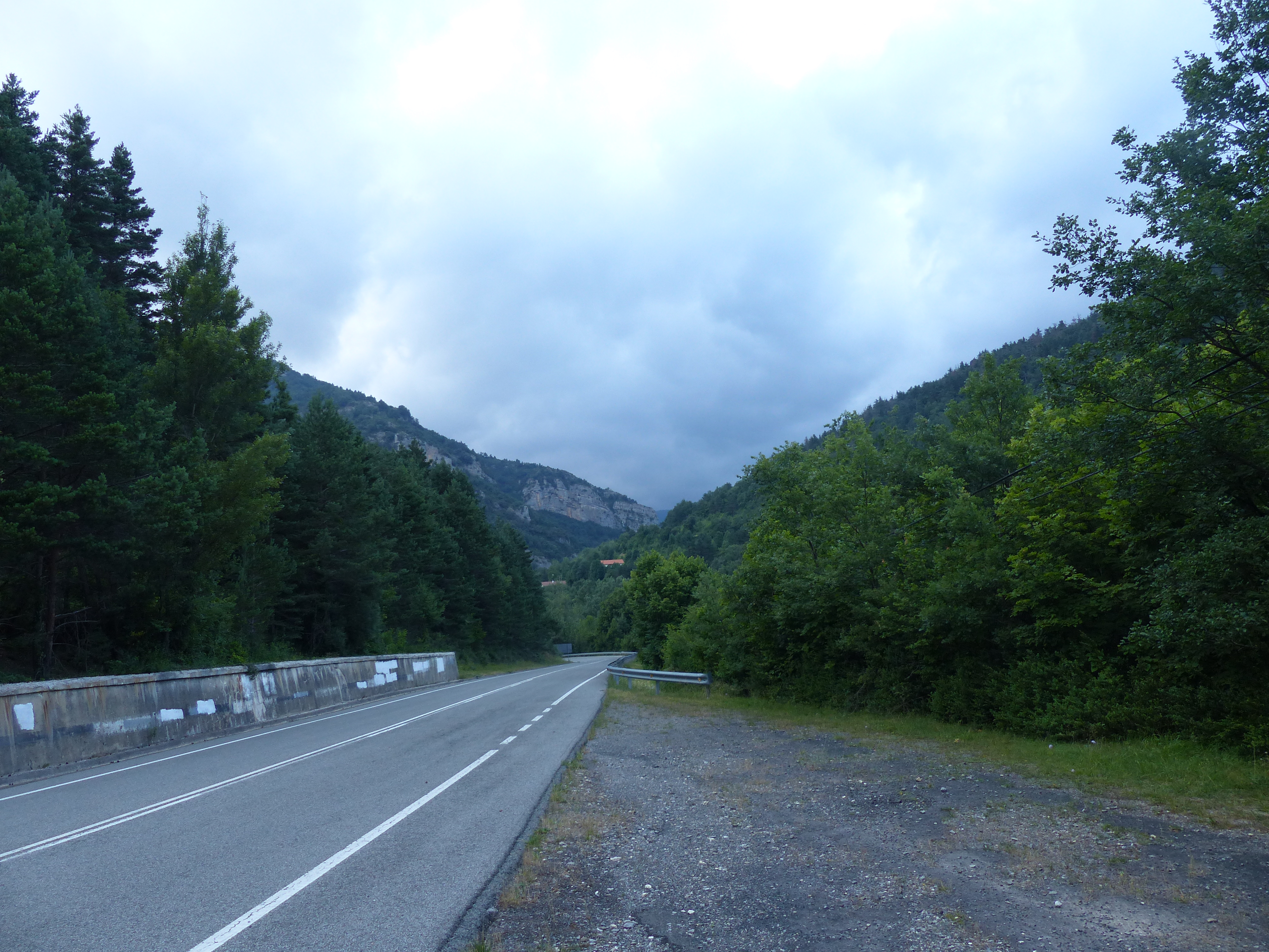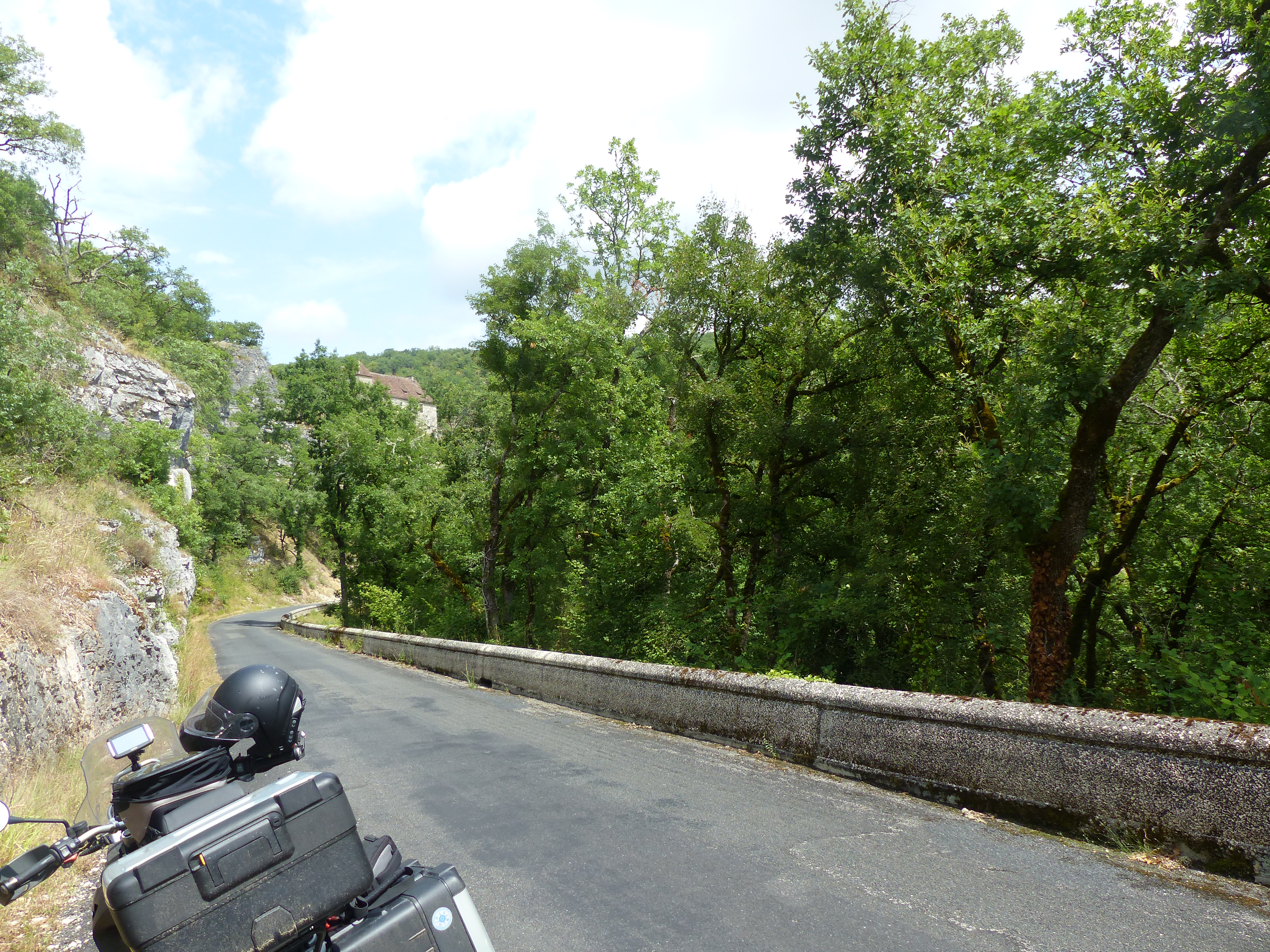 Die Grenze habe ich dann in den Wolken überquert und ich hatte mehrere Kilometer nur eine Sicht zwischen 10 und 40 Metern. Ich war froh, dass ich vom Navi die Informationen über den Straßenverlauf bekam. Danach Regen, Regen, Regen. Fast 200km bin ich in Folge im Regen gefahren. Das war besonders ärgerlich, da auch in französischen Pyrenäen die Streckenführung recht schön war, aber ich es natürlich deutlich vorsichtiger angehen lassen musste Dies hat sich natürlich auch entsprechend auf die heutige Durchschnittsgeschwindigkeit ausgewirkt. Eine kurze Regenpause hatte ich zum Glück um ein kleines Frühstück einzunehmen. Nachher wurde es dann doch noch schöner, aber die Temperatur stieg nicht über 26°C. Das langärmlige T-Shirt habe ich dann noch ausgezogen, aber die Wolken überzeugten mich mein Regenschutz im Anzug zu lassen. Ein paar kleine Schauer gab es dann auch noch, aber nicht so heftig, dass ich bei der Fahrt wesentlich eingeschränkt wurde und konnte noch ein paar schöne Streckenabschnitte schon tiefer in Frankreich geniessen. Hier ein Eindruck zu der Zeit des besten Wetters.