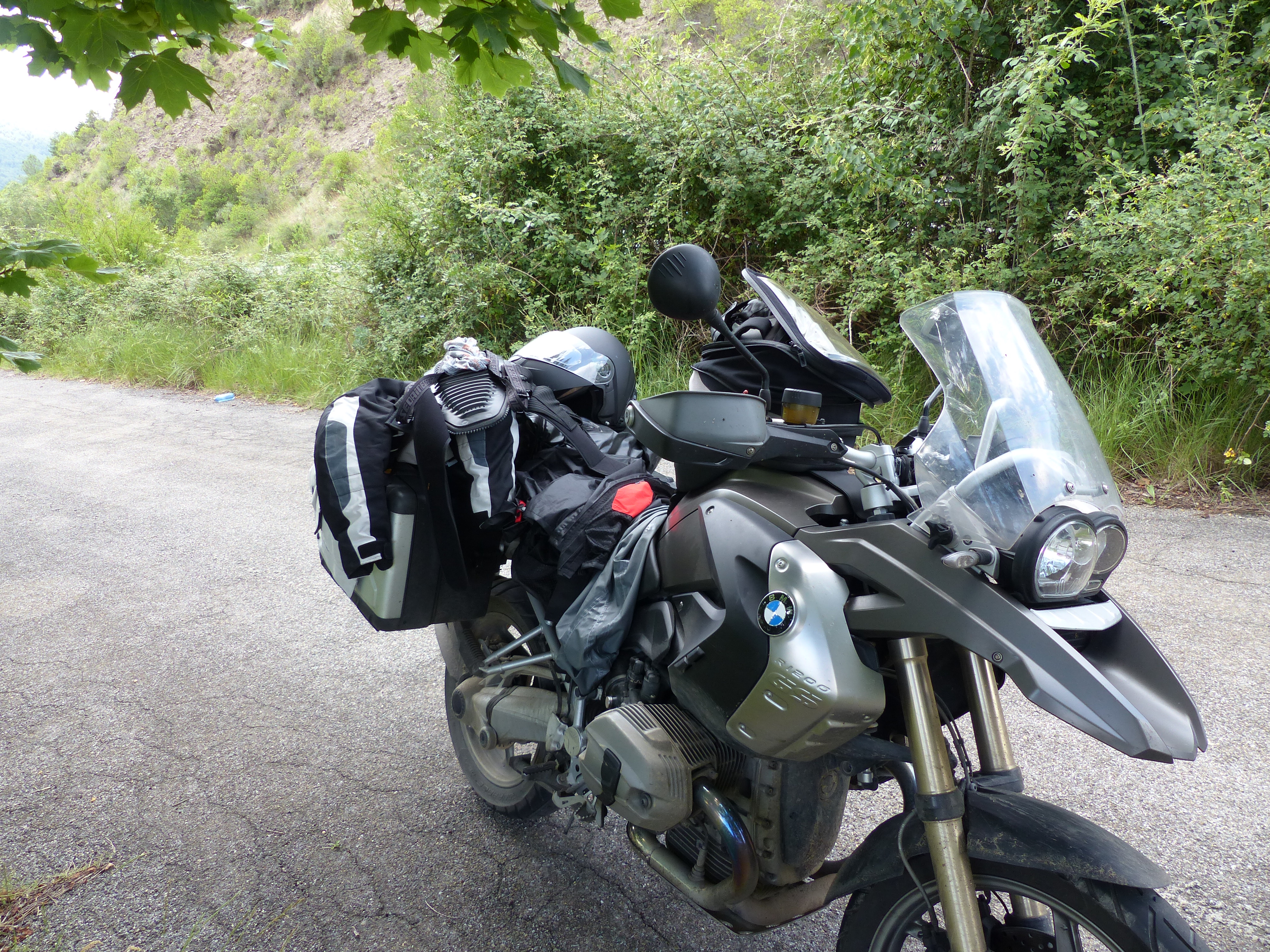 Nachdem der Wetterbericht für den Nachmittag Starkregen für die Pyrenäen vorhergesagt hat, war ich wieder der Erste beim Frühstück. Dort wurde ich von einem „echten“ Frühstück mit Müsli, Wurst und Käse überrascht. So gestärkt ging es los – in die Kälte! Schon am Abend zuvor brauchte ich beim Abendessen auf der Terrasse mein Sweatshirt und so begann auch der Tag heute. Schon nach ein paar Kilometern Fahrt musste ich alle Luftöffnungen am Anzug verschließen und auch noch die wasserdichte Einlage „einbauen“. Mehr als 17°C zeigte das Thermometer nicht an und die Fahrt wurde von Schauern und Nebel begleitet. Zwischendurch gab es auch ein paar trockene Zeiten und es konnten einige Kurven abgezirkelt werden, Ich weiß nicht warum, aber in Frankreich scheint Kies das Mittel der Wahl nach Straßenreparaturen zu sein und gepaart mit der teilweise schlechten Sicht wurde meine Konzentration ordentlich gefordert.
