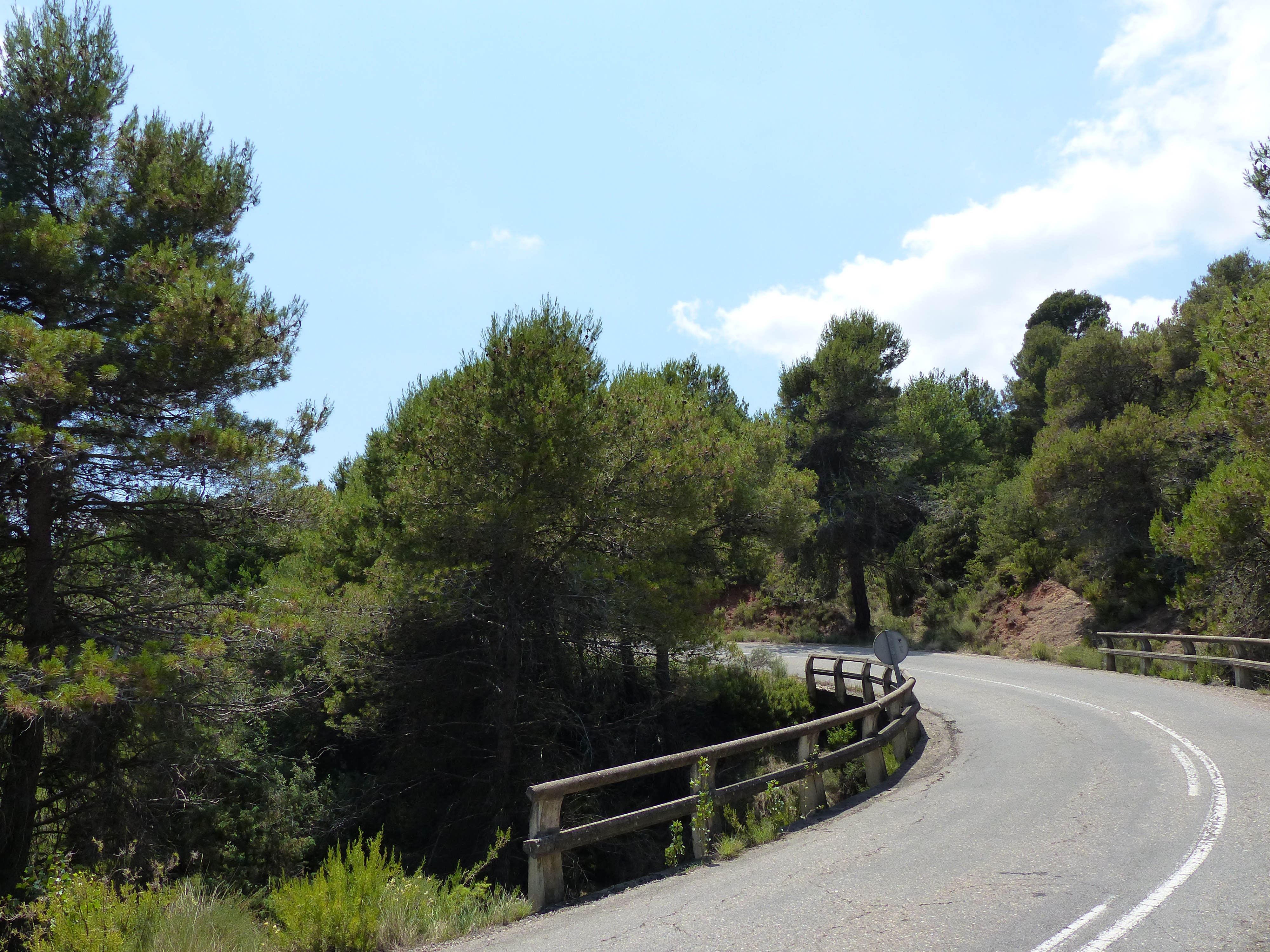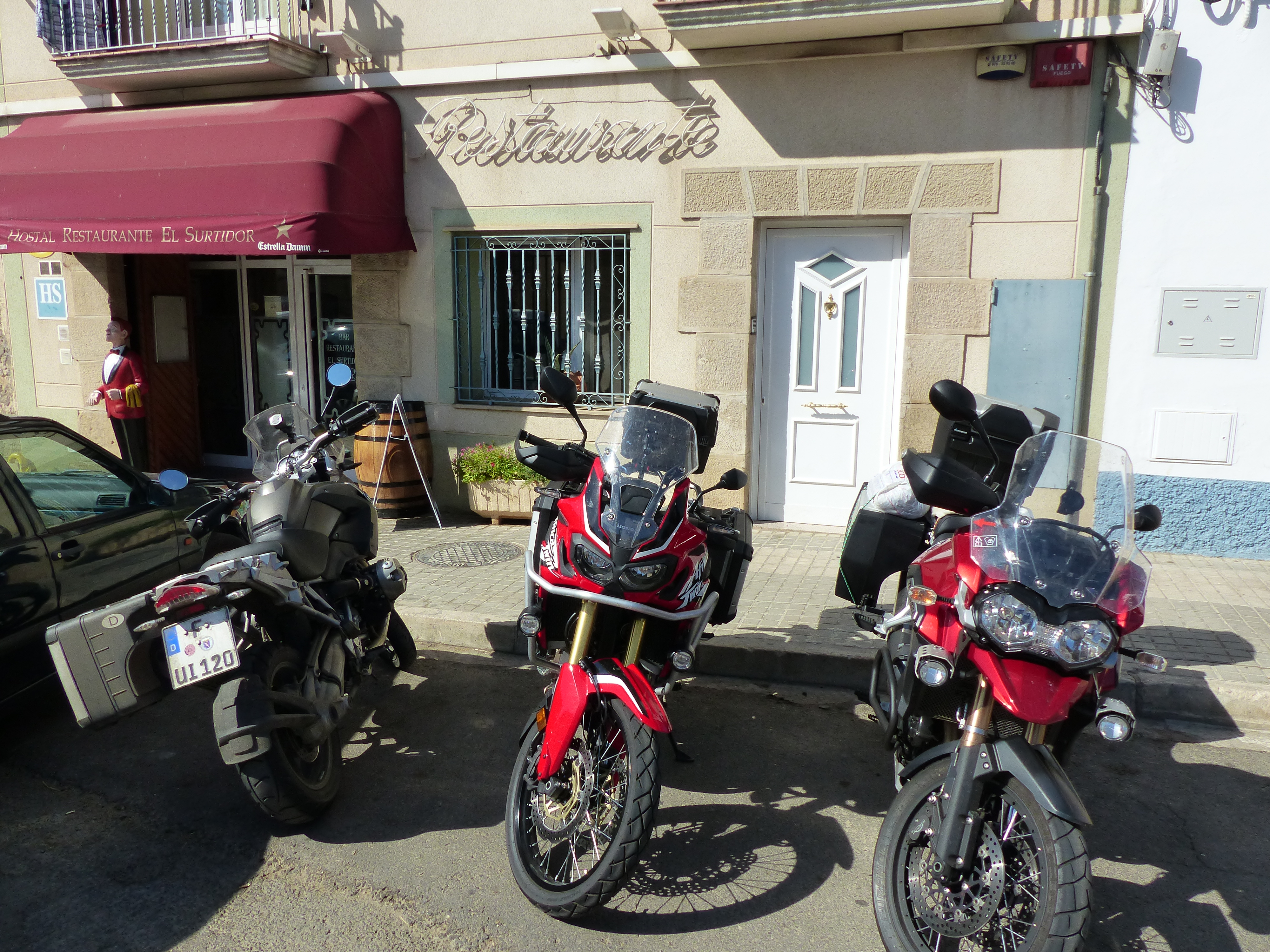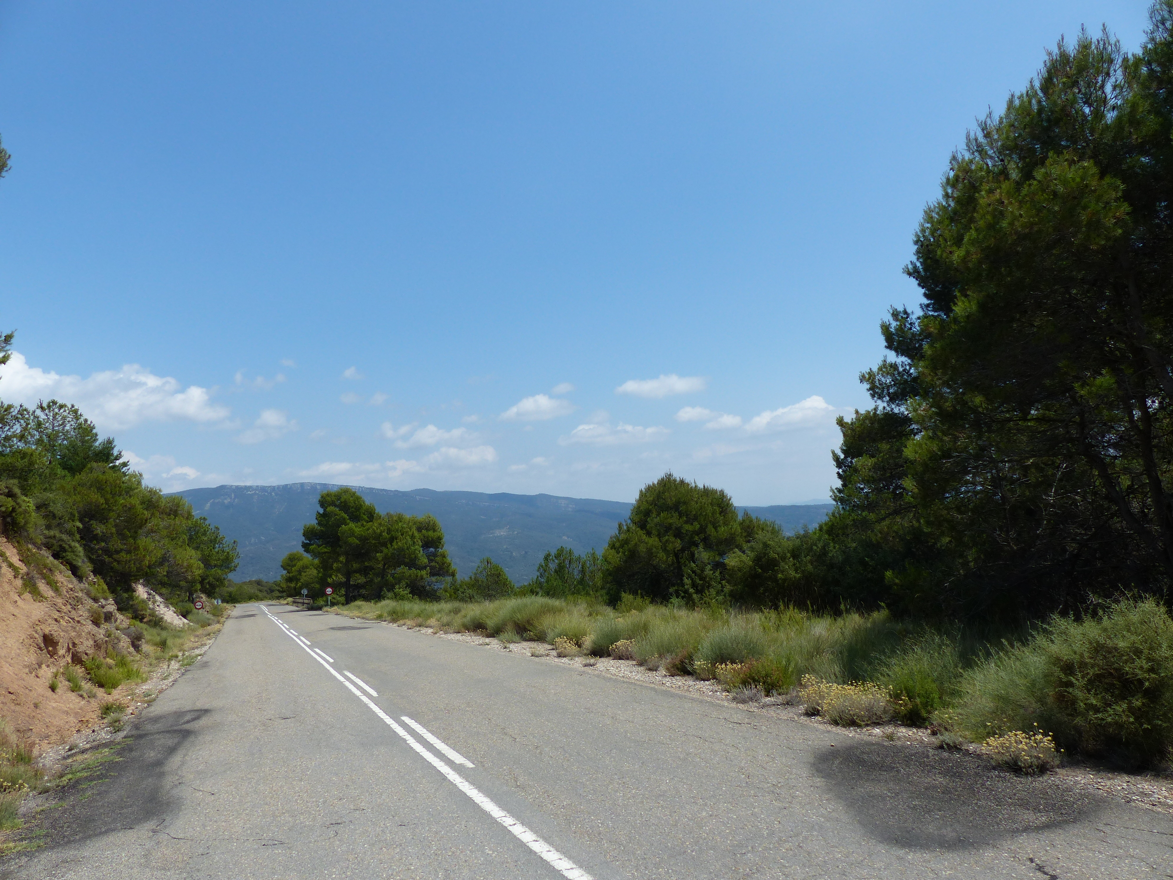 Auf spanischer Seite wurde ich von 26°C bei Sonnenschein begrüßt. So konnte ich die guten und kurvenreichen Straßen der Abfahrt genießen und meinen Anzug nach einigen Kilometern auch wieder sommertauglich machen. Im Hinterland wieder wunderbare Natur und abgelegene Strecken. Eindrucksvoll waren auch die Tafelberge im spanischen Norden in ansonsten eher flachem Gebiet. Mit der Zeit bekam ich dann auch von der Temperatur her einen Vorgeschmack auf die kommenden Tage. Angekommen in Caspe bin ich bei 34°C.